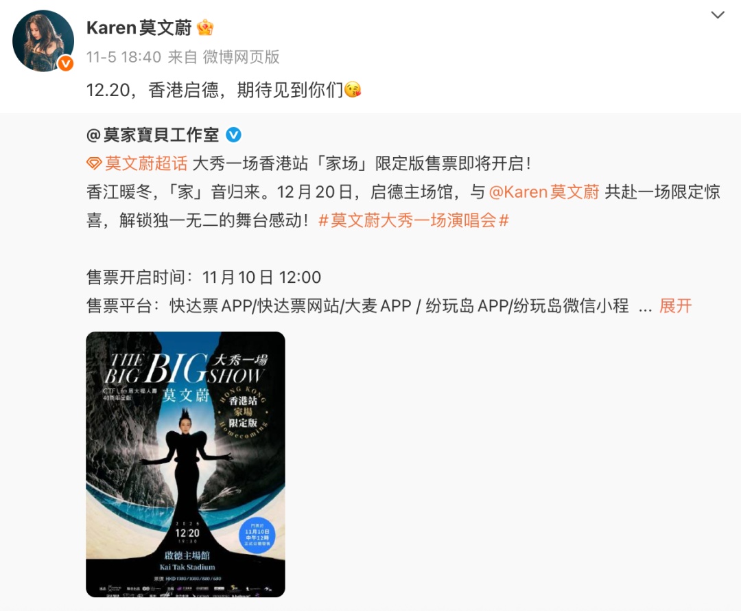 此前11月5日,莫文蔚宣布将在12月20日于香港启德主场馆举办演唱会。