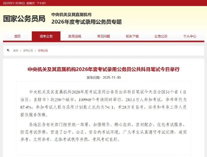 中央机关及其直属机构2026年度考试录用公务员公共科目笔试今天在全国31个省(自治区、直辖市)的250个城市、109948个考场同时举行,283.1万人参加考试,参考率约为87.4%,参加考试人数与录用计划数之比约为74: 1,有28万名监考、巡考和考务工作人员提供服务保障。