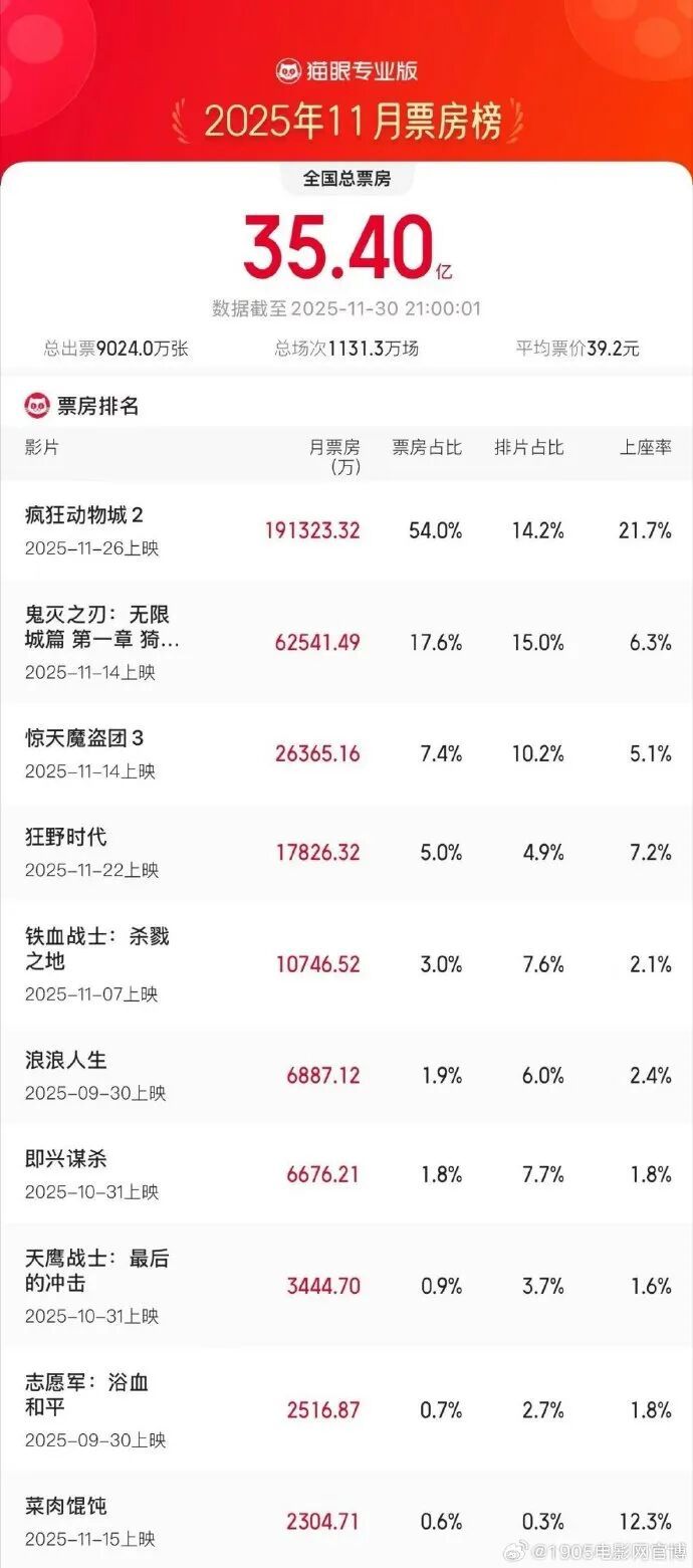 据网络平台数据,截至11月30日,2025年11月总票房35.40亿,《疯狂动物城2》上映5天登顶11月票房榜。
