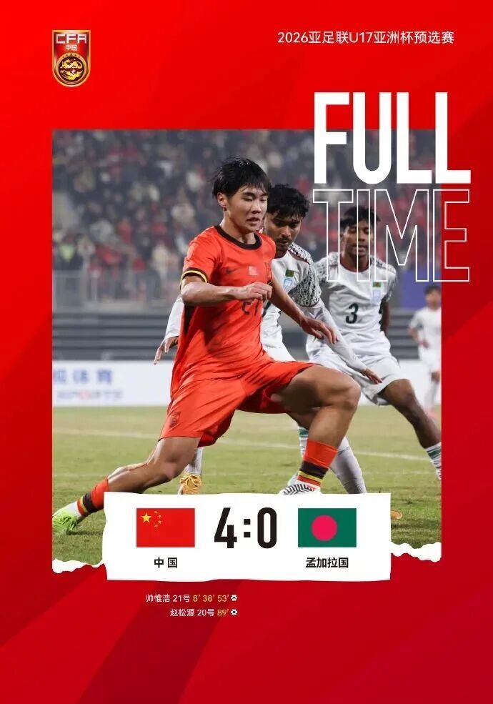 在11月30日晚重庆铜梁进行的U17亚洲杯预选赛A组最后一轮角逐中,2009年龄段中国U16队凭借帅惟浩的帽子戏法,以及替补中锋赵松源锦上添花的破门,4比0完胜同组最强竞争对手孟加拉国U16队,从而以5连胜、进42球、零失球的绝对强势战绩锁定本组头名,如愿挺进明年在沙特阿拉伯举行的决赛阶段赛事,从而为冲击2026年U17世界杯入场券迈出了坚实的一步。