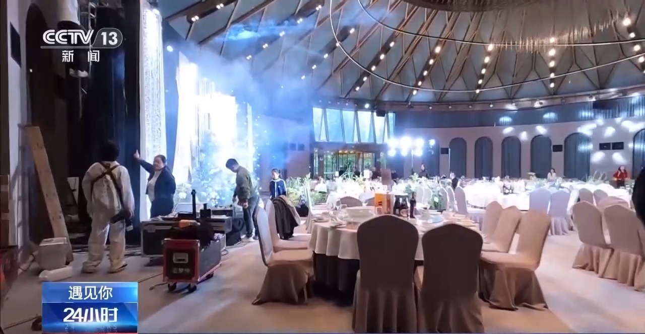 转场到了举行婚礼仪式的酒店,冷佳拿出话筒,和调音台的工作人员对接好收声事宜。接下来,他就进入了最紧张的时刻,拍摄仪式只有一次机会,冷佳尽力去拍下更多素材。