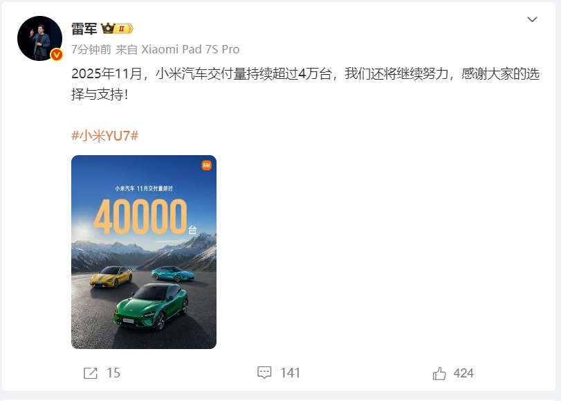 12月1日,雷军发文:2025年11月,小米汽车交付量持续超过4万台,我们还将继续努力,感谢大家的选择与支持!