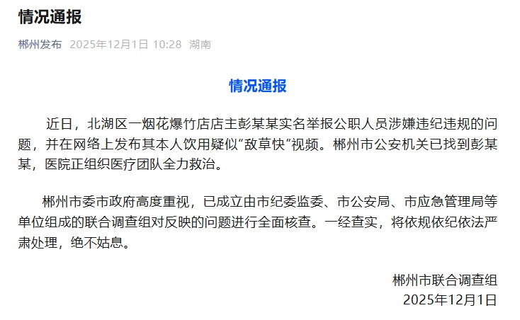 近日,北湖区一烟花爆竹店店主彭某某实名举报公职人员涉嫌违纪违规的问题,并在网络上发布其本人饮用疑似“敌草快”视频。郴州市公安机关已找到彭某某,医院正组织医疗团队全力救治。