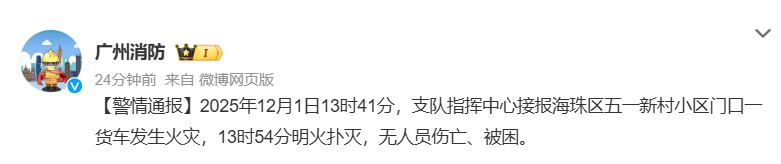 12月1日,广州消防发布警情通报:2025年12月1日13时41分,支队指挥中心接报海珠区五一新村小区门口一货车发生火灾,13时54分明火扑灭,无人员伤亡、被困。