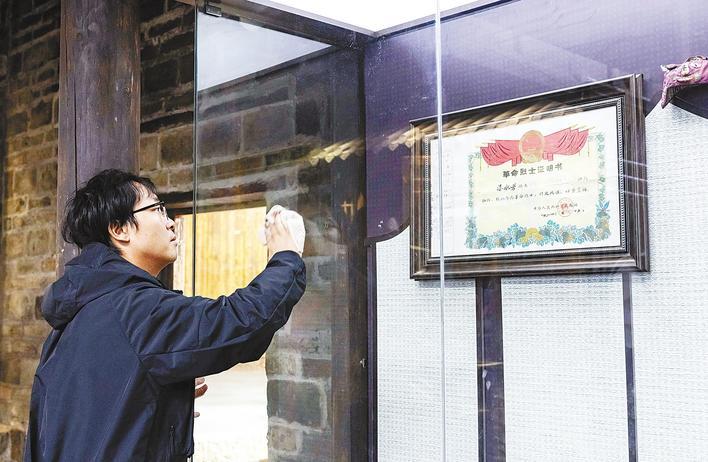 漆黎明擦拭橱窗,精心维护太爷爷漆承芳的革命烈士证明书。