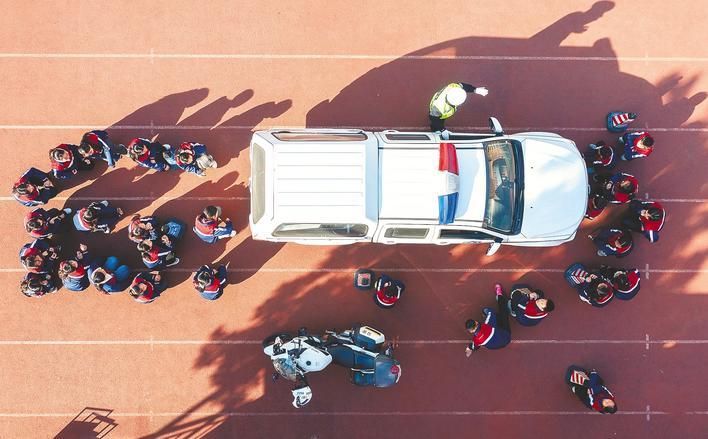 11月28日,民警教同学们认知车辆盲区。当日,襄阳市诸葛亮中学开展全国交通安全日主题实践活动,民警通过安全头盔规范佩戴实操、交通标识趣味识别、汽车盲区实景认知等形式,让同学们在互动参与中上了一堂“交通安全实战课”。(视界网 李旭晖 摄)