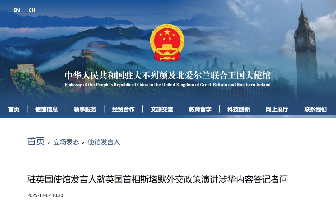 中国驻英国大使馆网站12月2日消息,驻英国使馆发言人就英国首相斯塔默外交政策演讲涉华内容答记者问。
