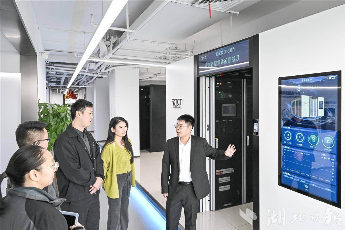 德塔森特(武汉)数据科技有限公司的工作人员讲解模块化微型机房一体机的技术亮点。(湖北日报全媒记者 任勇 摄)