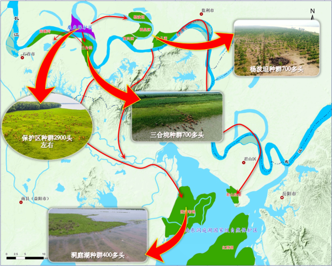 石首保护区麋鹿种群由最初引进的64头发展到超4500头,已从保护区扩散到周边,包括:三合垸、杨波坦、兔儿洲及湖南东洞庭湖,且全部实现了自然繁衍,恢复了野生习性,成为目前世界上最具规模与活力的麋鹿野生种群分布区域。
