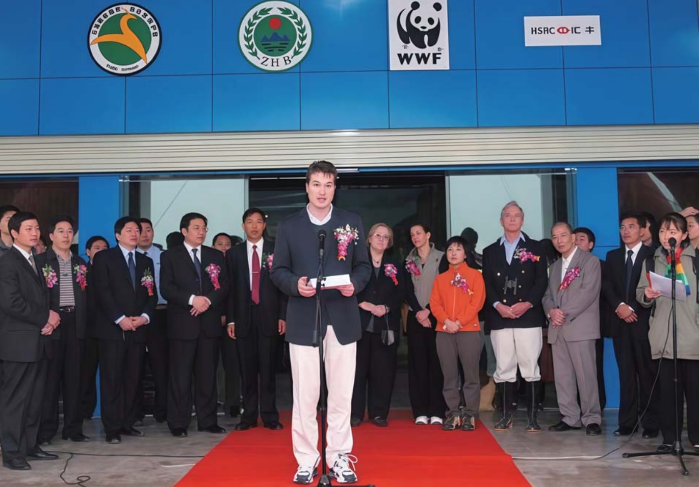 2005年10月19日,石首麋鹿国家级保护区举行庆祝麋鹿回归20周年活动,英国乌邦寺罗宾勋爵讲话。(资料图片)
