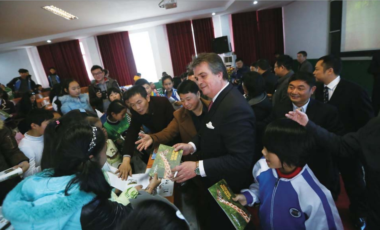 2015年11月18日,英国十五世贝德福德公爵在石首横沟市镇中学与学生们互动。(资料图片)