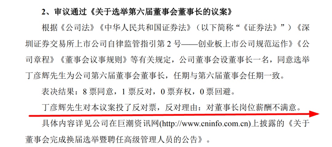 据媒体此前报道,因对董事长岗位薪酬不满意,艾比森董事长丁彦辉在公司《关于选举第六届董事会董事长的议案》中投出了唯一的一张反对票。
