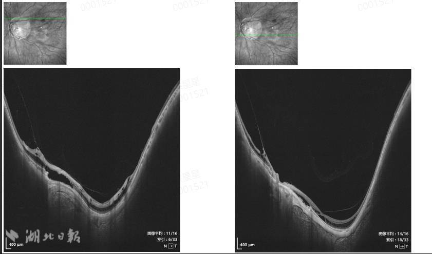 经查,吴先生右眼裸眼视力0.02,戴镜矫正视力为0.5;左眼裸眼视力0.02,戴镜矫正视力却只有0.1。扫频OCT检查进一步显示,他的右眼黄斑部神经上皮层内有低反射暗腔,呈桥样连接;左眼黄斑部网膜表面可见中高反射光带,与网膜呈牵拉状,神经上皮层内及层下见低反射暗腔,部分呈桥样连接。进一步检查确认,吴先生是因高度近视引起的双眼视网膜劈裂症,其左眼病情更为严重,需要手术治疗,而其右眼因为高度近视周边有变性区,需要择期进行预防性激光治疗,以避免进一步进展为视网膜裂孔或视网膜脱落等严重并发症。