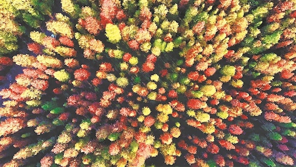 从空中俯瞰,一株株红杉如同一朵朵盛开的花朵,深深浅浅的红色与金色交织,在阳光的穿透下,洒下温暖而梦幻的光影,让人仿佛闯入浪漫的童话秘境。
