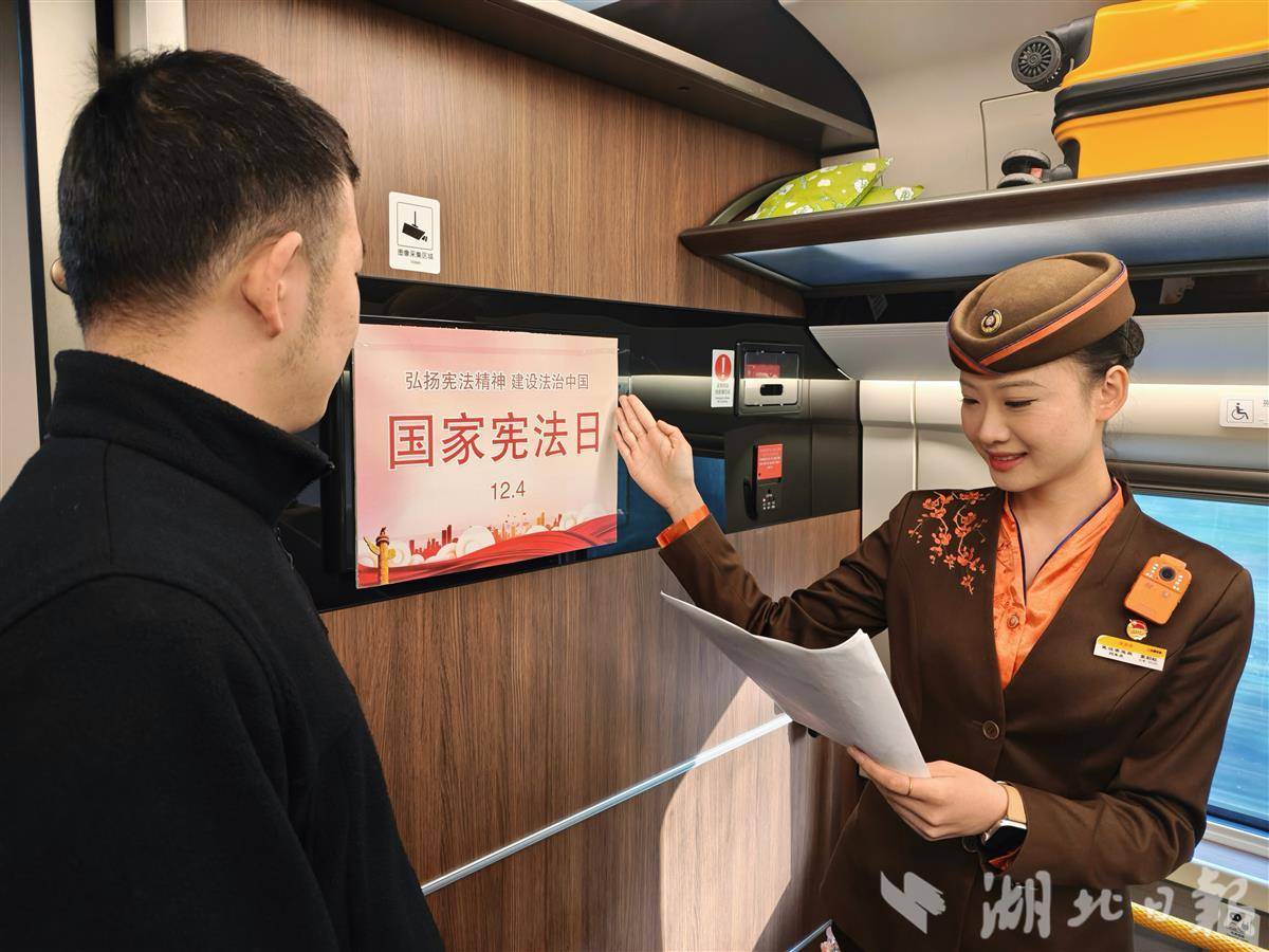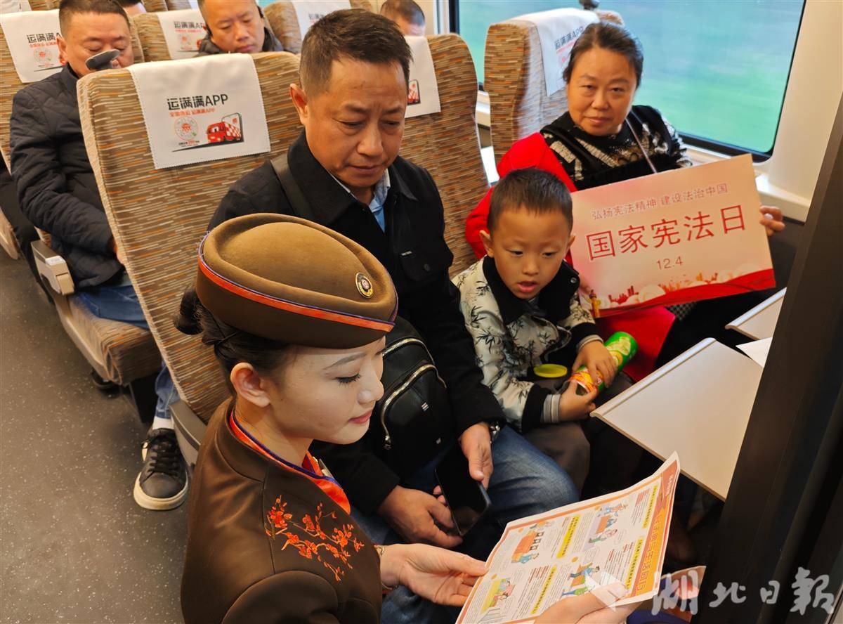 12月2日,武汉客运段武汉南线动车组车间担当的G1017次高铁列车上,列车员和旅客一起开展了以“宪法伴我行,平安乘高铁”为主题的普法宣传活动。每年12月4日是国家宪法日。活动中,列车员蒙彩虹化身“普法宣传员”,在车厢内设置普法宣传角,向旅客发放宪法和铁路运输相关资料并细致讲解。针对旅客关心的高铁霸座、携带危险品、扰乱车厢秩序等常见问题,结合《中华人民共和国民法典》《铁路安全管理条例》等法律法规,用通俗易懂的语言讲解相关内容,明确告知旅客“霸座属违法行为,需承担民事责任”“携带易燃易爆物品进站乘车将面临行政处罚”等法律后果,引导旅客树立“学法懂法,文明乘车”的意识。(湖北日报通讯员 赵语嫣 摄)