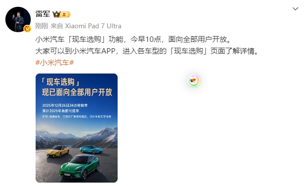小米汽车此前表示,所有现车都已通过严格质检,部分车型经官方修复,都是没有登记过的车辆。购买现车,可享快速提车、完整原厂质保和售后,部分车型可享优惠。2025年12月26日24点前锁单,预计2025年底前可提车。如因小米汽车的原因导致2026年完成开票交付,可享跨年购置税补贴。
