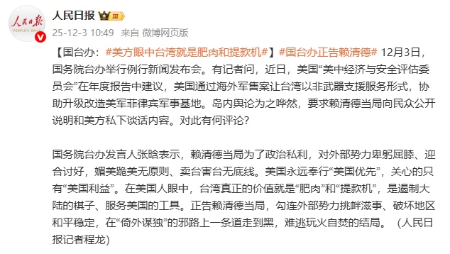 国务院台办发言人张晗表示,赖清德当局为了政治私利,对外部势力卑躬屈膝、迎合讨好,媚美跪美无原则、卖台害台无底线。美国永远奉行“美国优先”,关心的只有“美国利益”。在美国人眼中,台湾真正的价值就是“肥肉”和“提款机”,是遏制大陆的棋子、服务美国的工具。正告赖清德当局,勾连外部势力挑衅滋事、破坏地区和平稳定,在“倚外谋独”的邪路上一条道走到黑,难逃玩火自焚的结局。