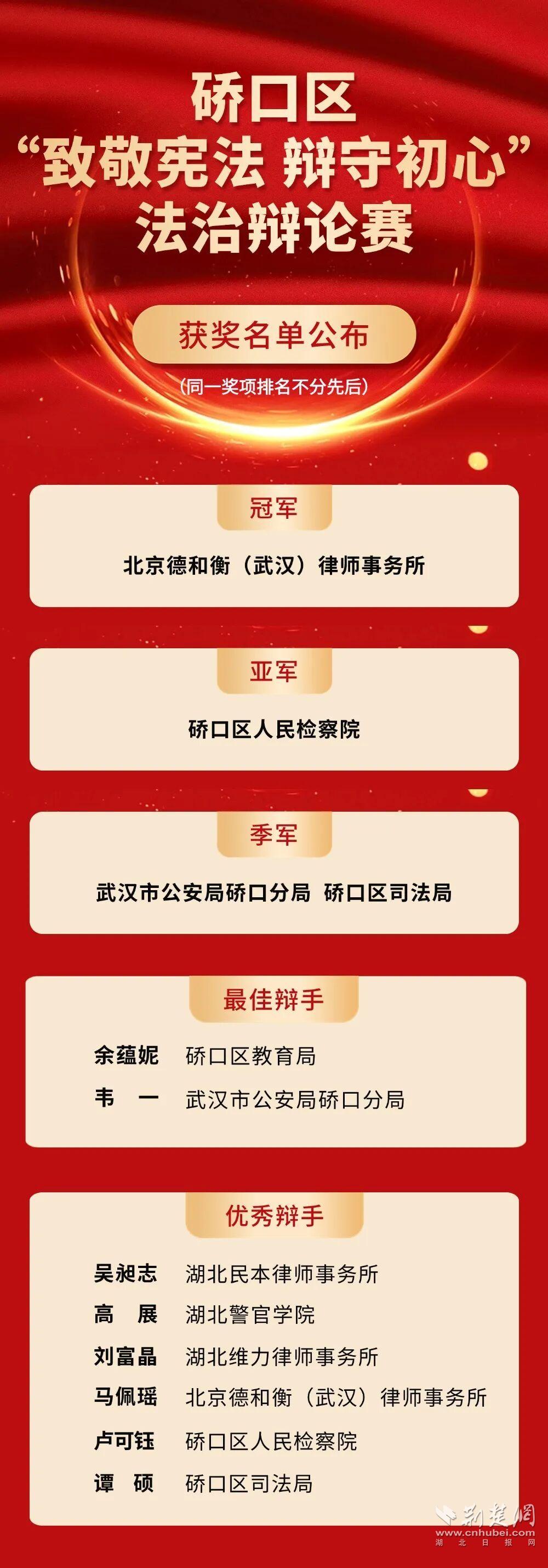 荆楚网(湖北日报网)讯(通讯员 郑筠楠、董丹)12月2日,由硚口区委依法治区办、区委宣传部、区司法局共同举办,北京云亭(武汉)律师事务所、北京德和衡(武汉)律师事务所、区文化馆共同承办的“致敬宪法 辩守初心”法治辩论赛圆满落幕。区委常委、区政府常务副区长邱华威,区人大常委会副主任陈洪波,区政府副区长、区公安分局局长刘辉,区政协副主席陈涛出席活动。