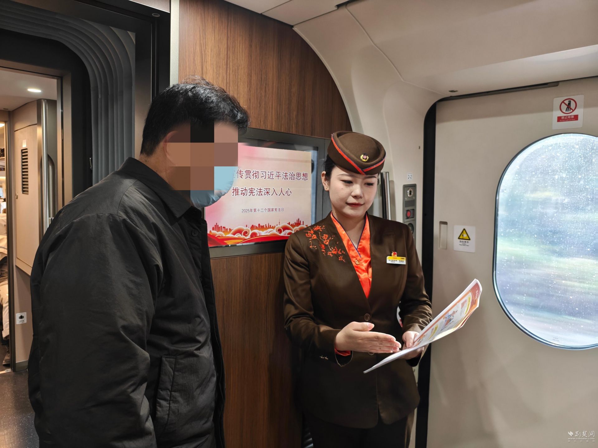 活动当天,列车员张蓝澜提前精心准备了宪法宣传海报、普法单等物资,营造出浓厚的普法氛围。列车启动后,列车乘务人员化身“普法使者”,走进车厢向旅客发放宣传资料,用通俗易懂的语言讲解宪法的重要意义、核心内容以及与日常生活密切相关的法律条款。