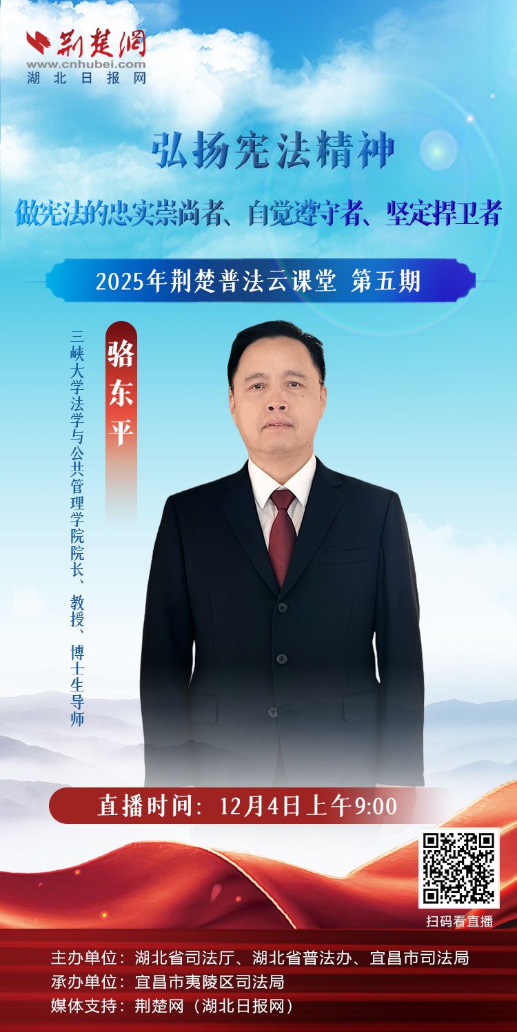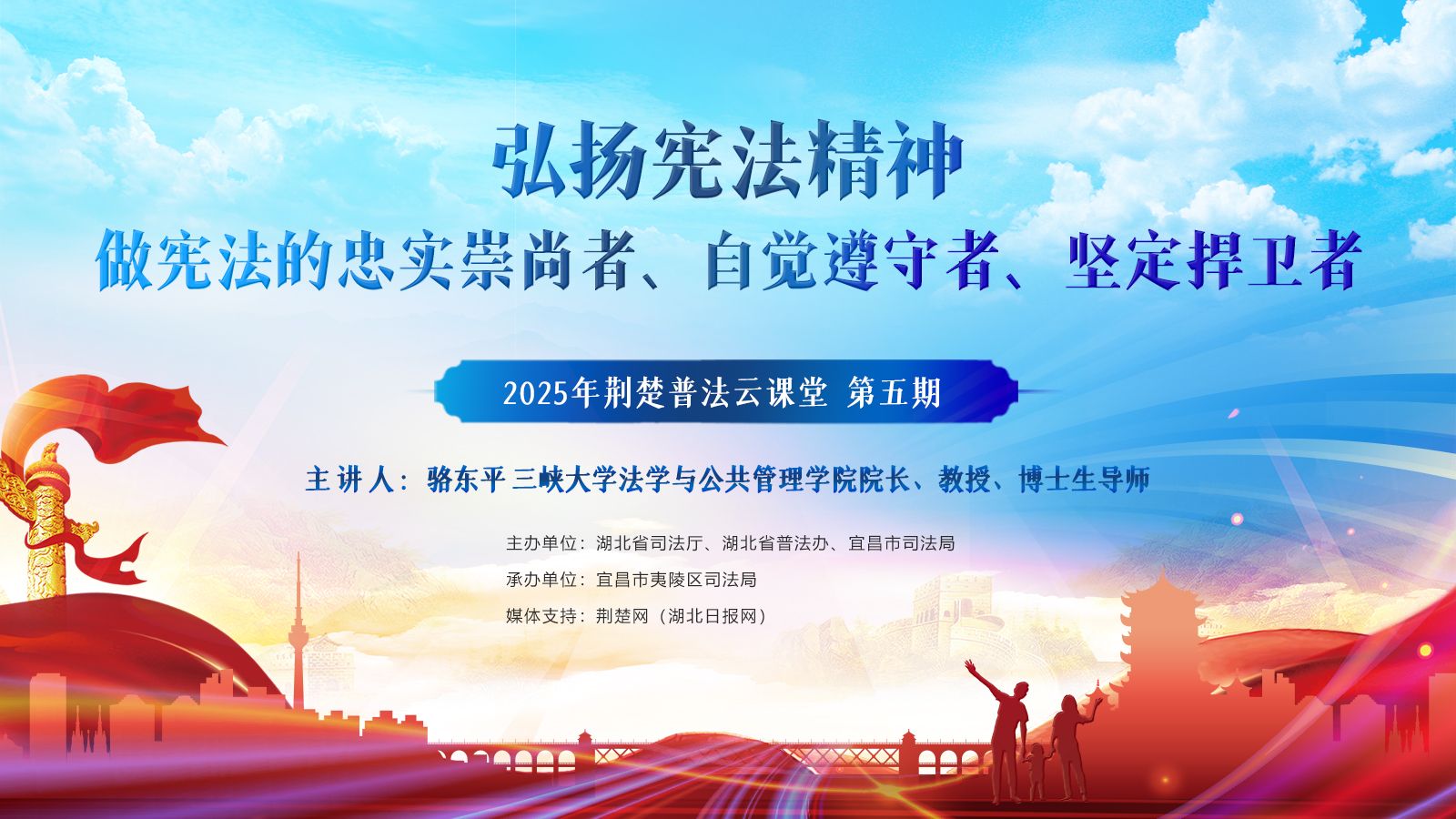 2025年“荆楚普法云课堂”第五期,特邀请到三峡大学法学与公共管理学院院长、教授、博士生导师骆东平在宜昌市夷陵区黄柏河法治文化公园进行“弘扬宪法精神 做宪法的忠实崇尚者、自觉遵守者、坚定捍卫者”直播授课。