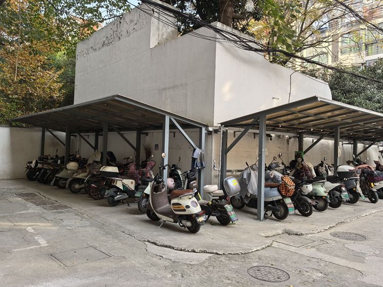 整治后的姜家园98-100号小区,新建了两个公共充电车棚,车辆停放得井井有条。受访者供图