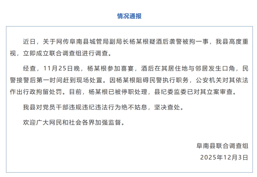 近日,关于网传阜南县城管局副局长杨某根疑酒后袭警被拘一事,我县高度重视,立即成立联合调查组进行调查。 经查,11月25日晚,杨某根参加喜宴,酒后在其居住地与邻居发生口角,民警接警后第一时间赶到现场处置。因杨某根阻碍民警执行职务,公安机关对其依法作出行政拘留处罚。