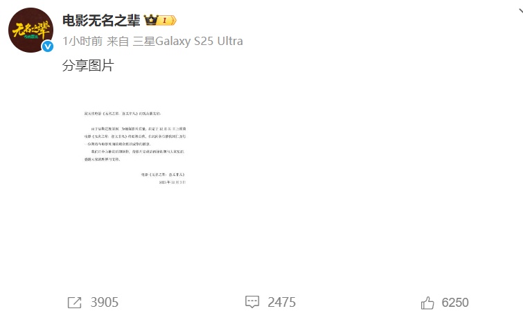 12月3日晚,@电影无名之辈 发布声明称,由于后期进度原因,为确保影片质量,原定于12月31日上映的电影《无名之辈:意义非凡》将延期公映。