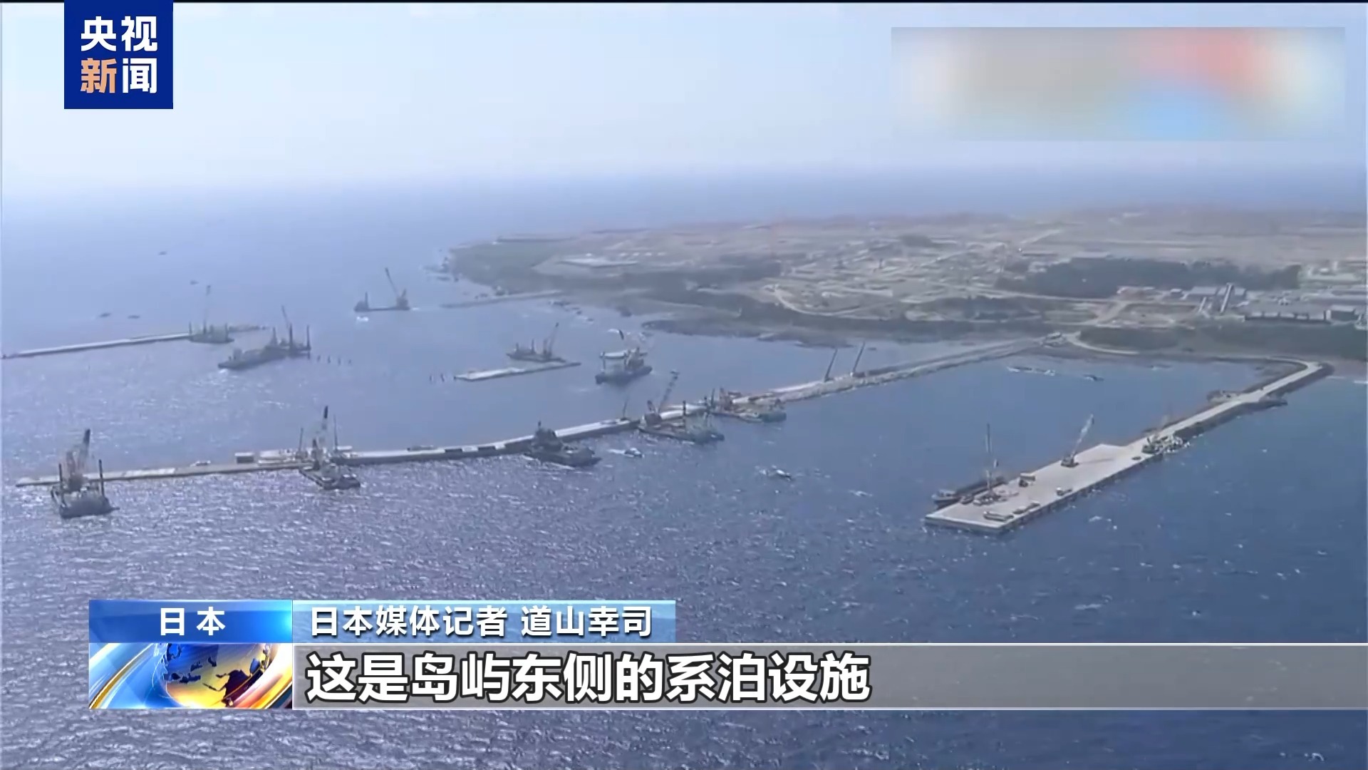 日本媒体记者 道山幸司:这是岛屿东侧的系泊设施,多艘作业船并排作业,工程正急速推进。