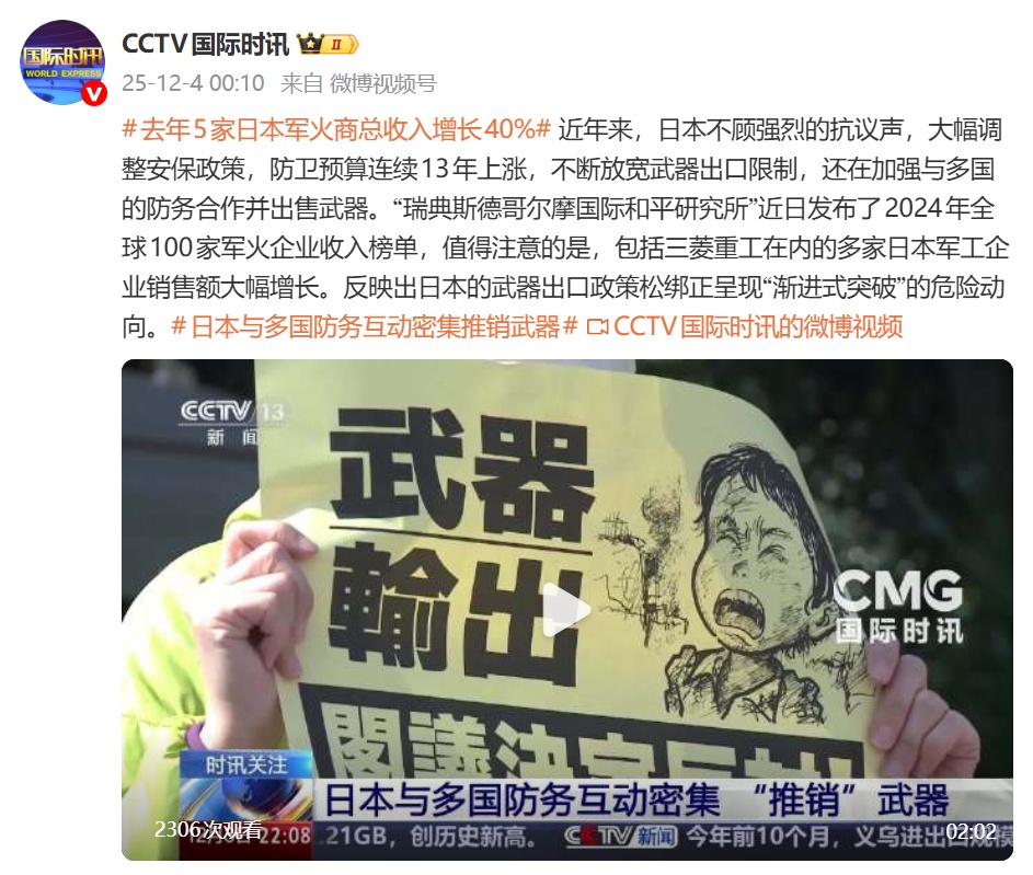 据CCTV国际时讯12月4日报道,近年来,日本不顾强烈的抗议声,大幅调整安保政策,防卫预算连续13年上涨,不断放宽武器出口限制,还在加强与多国的防务合作并出售武器。