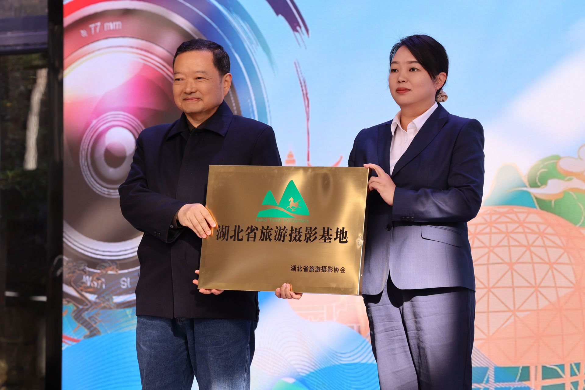 授牌环节成为全场焦点。杜勇代表湖北省旅游摄影协会,正式将“湖北省旅游摄影基地”牌匾授予龟峰山景区。这一权威认证,不仅是对景区“奇松、怪石、云海、杜鹃”独特自然景观的高度认可,更是对其红色文化、民俗底蕴等人文资源的充分肯定,标志着龟峰山在“生态+艺术”跨界融合道路上迈出里程碑式的一步。