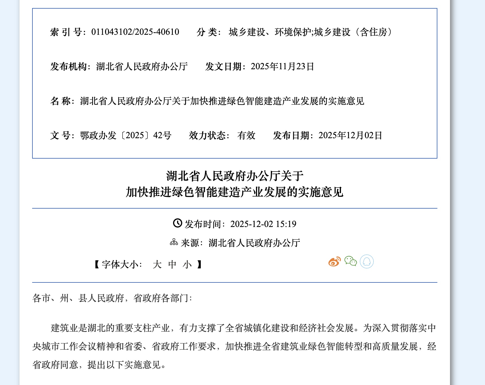 湖北省人民政府办公厅印发《关于加快推进绿色智能建造产业发展的实施意见》