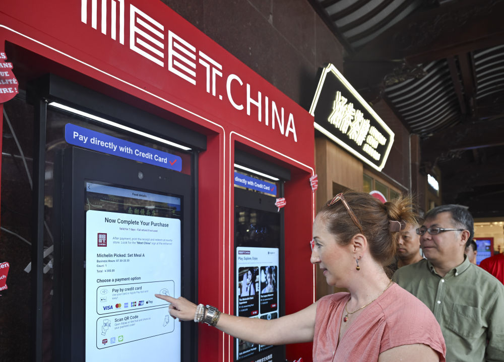 2025年9月27日,外籍嘉宾在上海豫园体验使用“Meet China”入境旅游数字消费大屏。新华社记者 陈浩明 摄