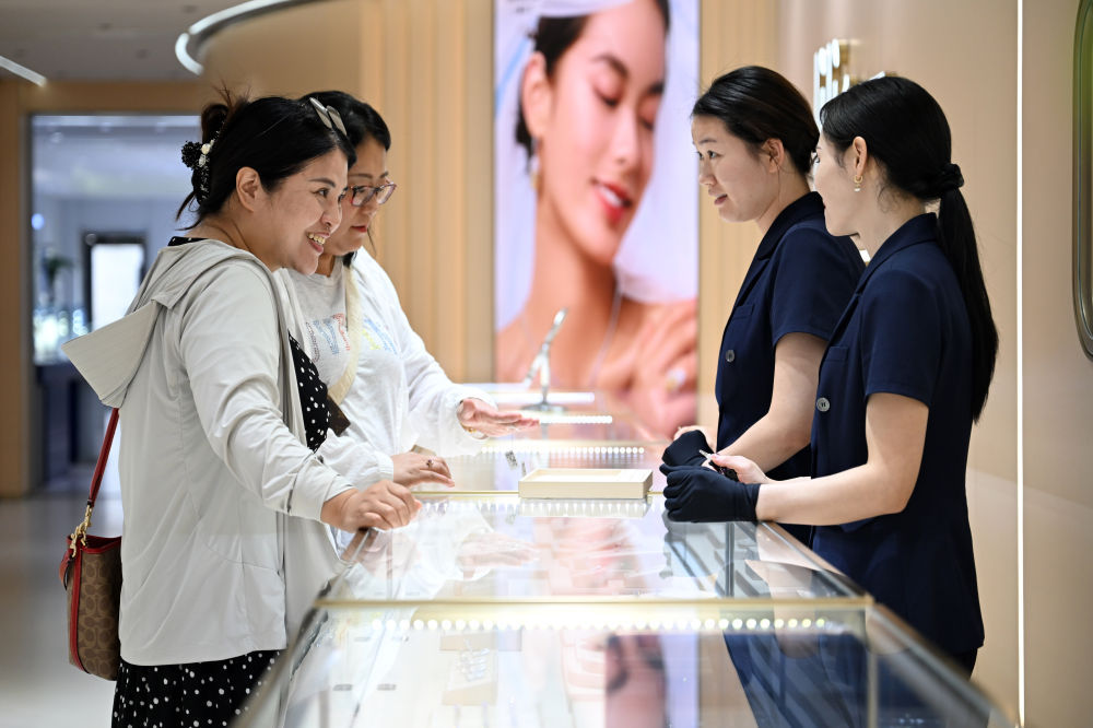 顾客在力量钻石直营首饰工厂店选购钻石首饰(6月11日摄)。华社记者 李嘉南 摄