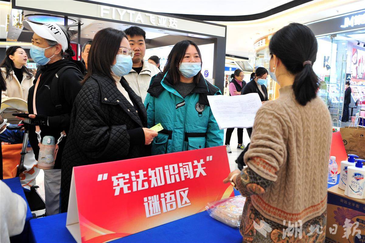 市民在“宪法知识闯关”谜语区参加竞猜法治谜语。