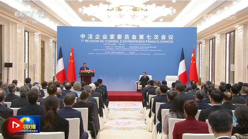 12月4日中午,国家主席习近平在北京同法国总统马克龙共同出席中法企业家委员会第七次会议闭幕式并致辞。