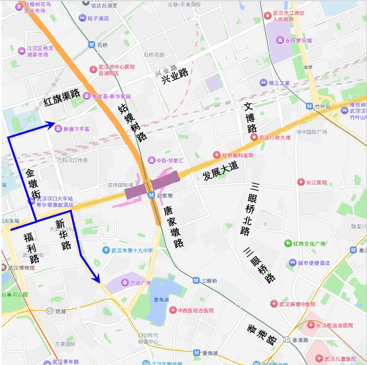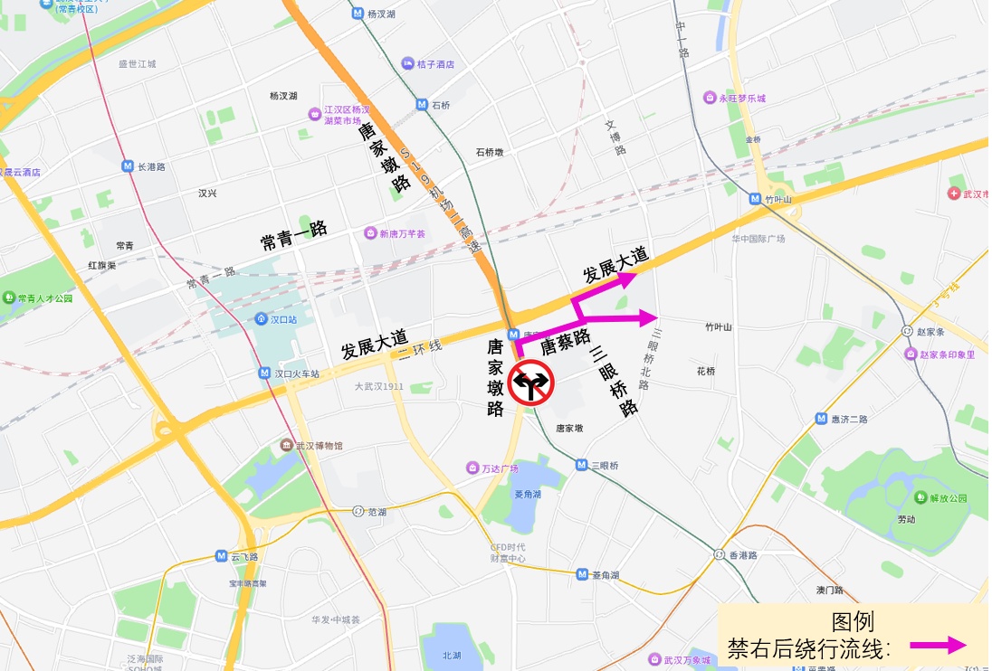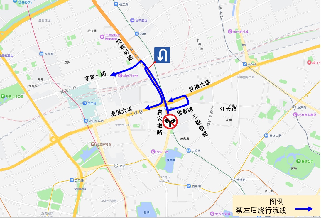 1.原通过唐家墩路口南进口左转往汉口火车站方向的车辆,可在路口直行800米后掉头返回发展大道,或绕行常青一路;也可绕行唐蔡路、三眼桥路、发展大道。