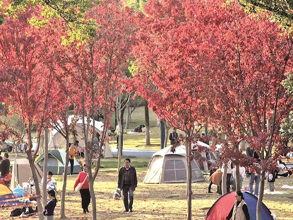 12月3日上午,武汉市江汉区常青公园内,红叶如霞,景色如画,不少市民在草地上扎起帐篷、铺上露营毯,悠闲地享受冬日暖阳。常青公园管理中心负责人表示,今年红叶季预计将持续到12月中旬,现已开放红叶景观和露营区域,欢迎市民前来赏景露营。据悉,目前该区王家墩公园、菱角湖公园、后襄河公园等都可以露营。楚天都市报极目新闻记者卢成汉 通讯员李军 王凯 彭敏摄影报道