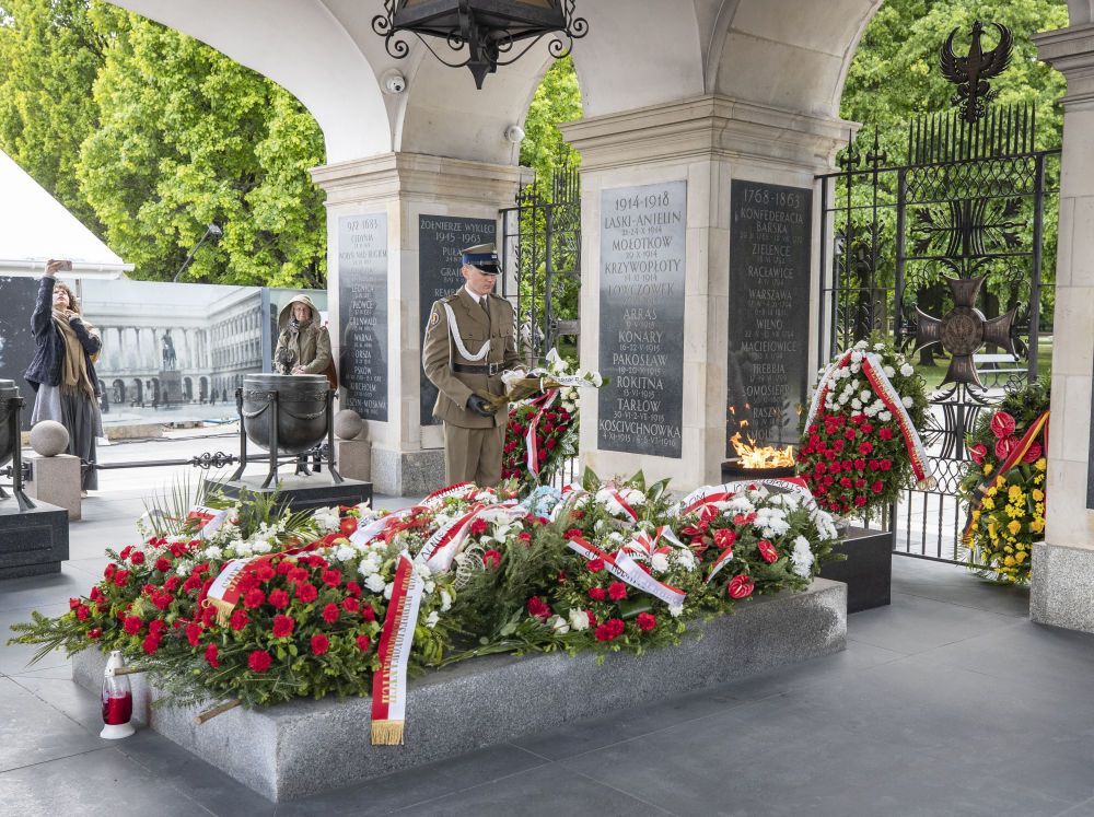 5月8日,人们在波兰首都华沙的无名烈士墓参加纪念活动。新华社记者 张帆 摄