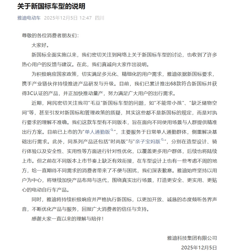 12月5日中午,雅迪科技集团有限公司发布《关于新国标车型的说明》,表示该公司生产的“毛豆”电动车(“单人通勤版”)在车型设计上有一些考虑不周的地方,给消费者带来了不便与困扰,对此深表歉意。