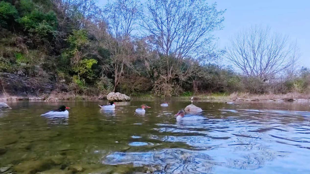首次在京山绿林发现中华秋沙鸭越冬是在2011年1月29日,由潜江市民刘哲明、陈德智等四人组成的江汉油田观鸟队。当时拍下四只鸭子,经反复比对确认为一雄三雌的中华秋沙鸭。彼时,武汉大学鸟类专家胡鸿兴称,在湖北京山目睹此鸟极为罕见,1980年前在洪湖、长湖等地偶见,数量不过三四只,异常稀少。此后每年,京山绿林富水河畔皆可见其俊俏身影:时而结伴觅食,时而追逐嬉戏,成为当地一道亮丽风景。