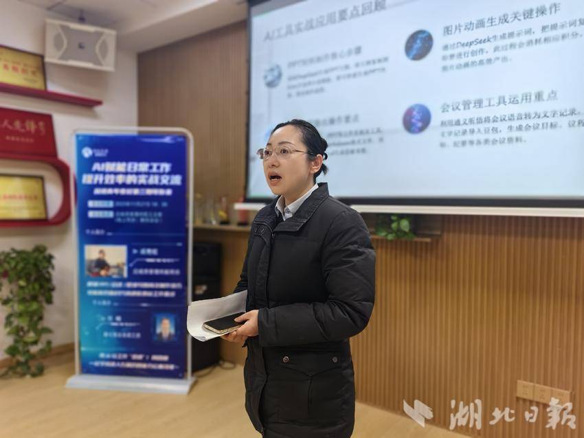 讲师侯畅则围绕“AI与工作效率”“PPT材料制作”“图片动画生成”三大模块,通过现场演示AI工具快速生成PPT框架、优化排版设计、制作创意配图和动画的全过程,直观展现AI如何让繁琐的材料制作工作“提质提速”;实训职工杨伦表示:“以前制作一份PPT需要半天时间,现在用AI工具20分钟就能完成,还能自动生成动画效果,效率提升太明显了!”现场互动频繁、学习氛围浓厚。