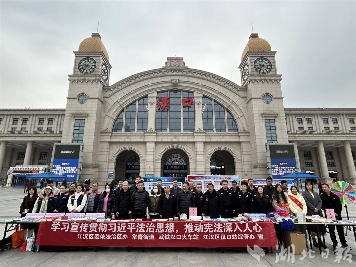 针对汉口火车站客流密集特点,江汉区综管办联合区委依法治区办、武铁汉口火车站、常青街道及税务、市场监管、民政等八家单位,在南广场开展法治问答、转盘抽奖、专业咨询等活动,向过往旅客动态普法。江汉经济开发区则在园区核心区域联合区人民法院、区委党校、贺家墩派出所等力量,通过横幅、展板、视频等方式营造氛围,接待咨询、发放宪法读本、法律风险防范指南等。