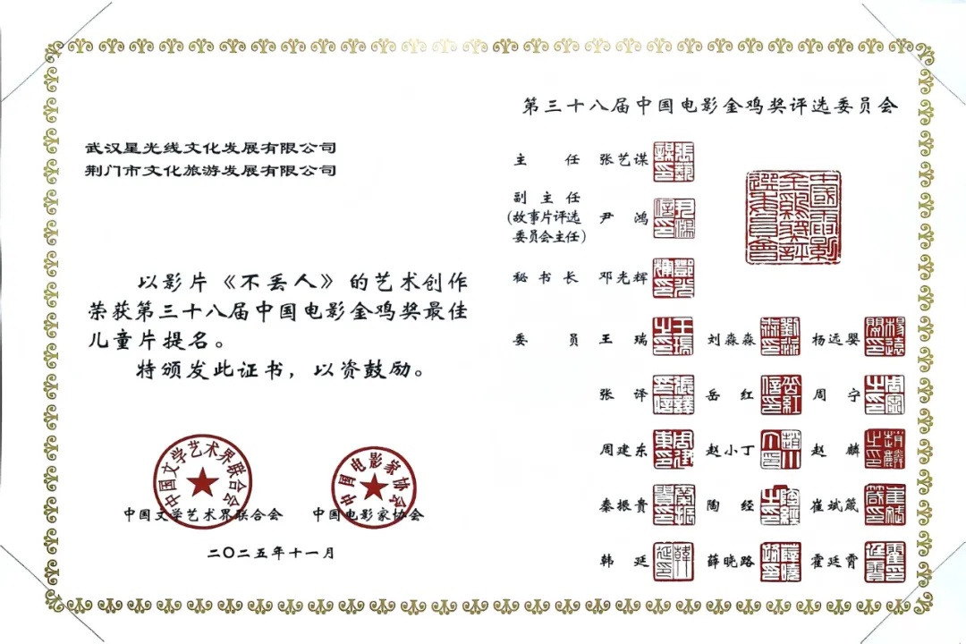 2025年中国金鸡百花电影节上,由武汉星光线文化发展有限公司出品,荆门市文化旅游发展有限公司联合出品,中共荆门市委宣传部、湖北省电影家协会联合摄制,湖北省文联指导的电影《不丢人》,荣获第38届中国金鸡奖最佳儿童片提名。
