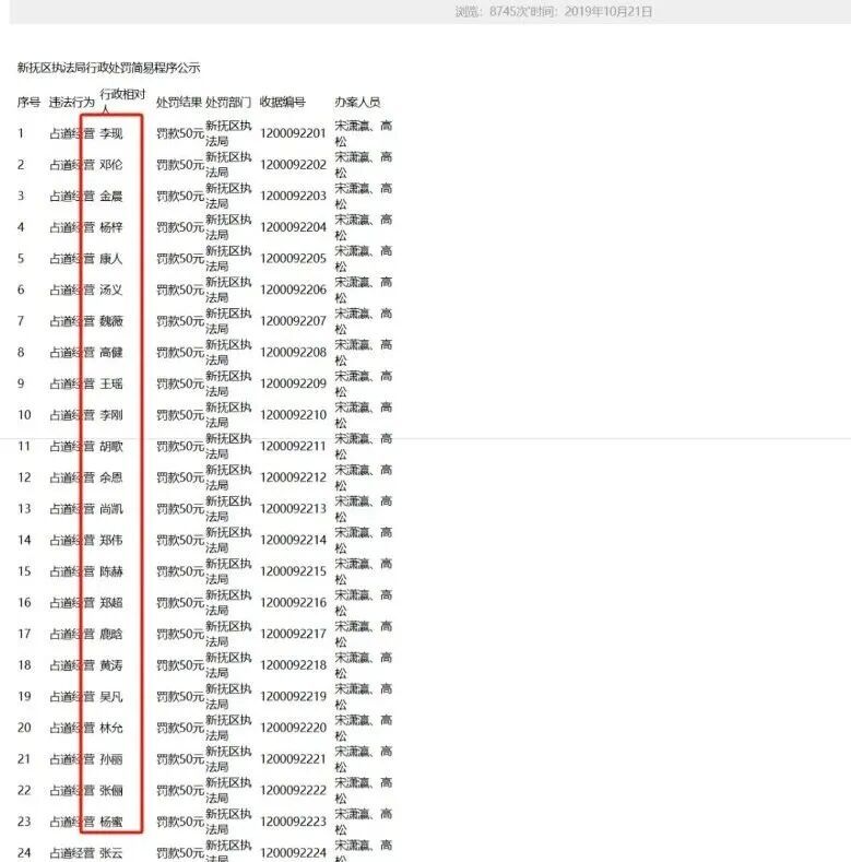 据现代快报,12月4日,有网友发现辽宁抚顺新抚区住建局于2019年10月21日公示的一占道经营处罚名单疑存猫腻,名单上的名字不但均为“姓氏+单名”的两字结构,而且还不少与知名艺人重名,如鹿晗、孙俪、李现、金晨、董璇等。