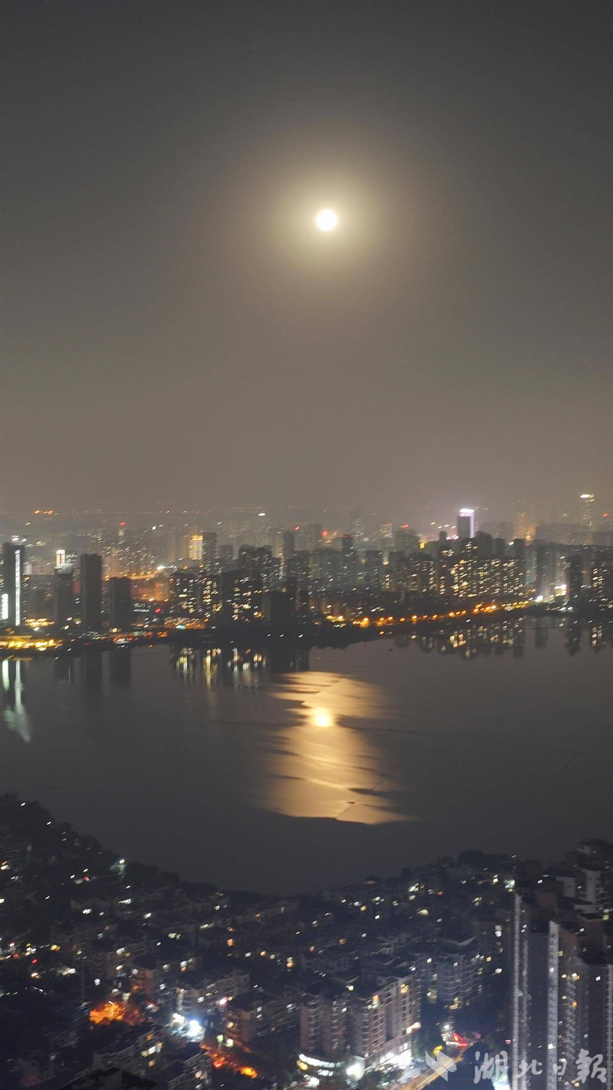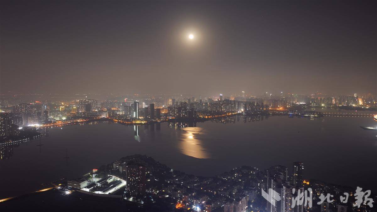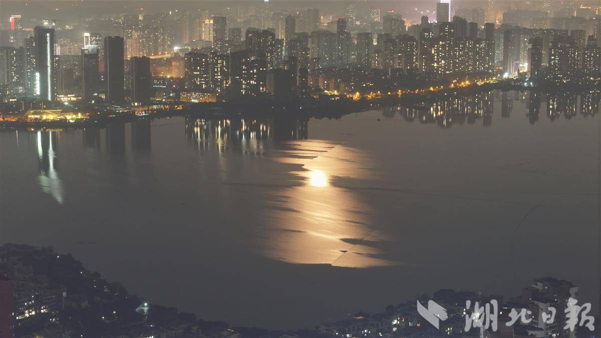 12月5日晚,今年最后一次超级月亮照亮江城。在武汉南湖畔,皎洁月光随涟漪拉长摇曳,形成“双月同辉”的景象。