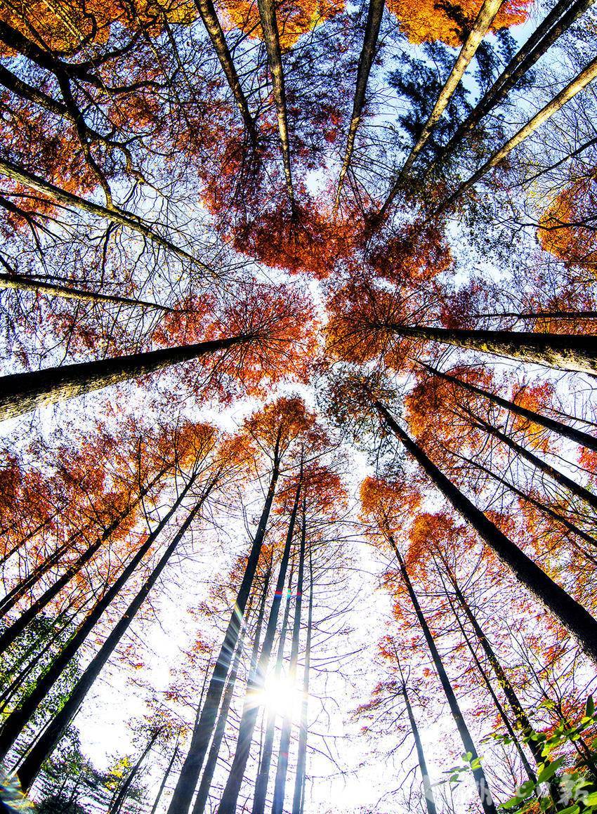 湖北日报客户端讯(通讯员陈功龙)巴东野三关铁场荒林场的初冬,阳光斜穿高耸的杉林,将金红的叶影剪作碎金,洒满小径。二十余万亩彩林依旧绚烂:红枫似火,黄杉若金,松柏的苍翠疏落点缀,自山脚迤逦至海拔1800米的峰巅,铺展成绵延的“彩色长廊”。抬头望去,橙红叶浪与澄净蓝天交织为穹顶;风过林梢,簌簌摇落一树金红,拂过肩头,仿佛沾了满身温煦阳光。蜿蜒山路上,薄脆的落叶如锦毡铺展,车轮轻碾时细响清浅,与穿过林间的风声相和,悠悠谱成这首属于巴东初冬的“色彩秘境”序曲。