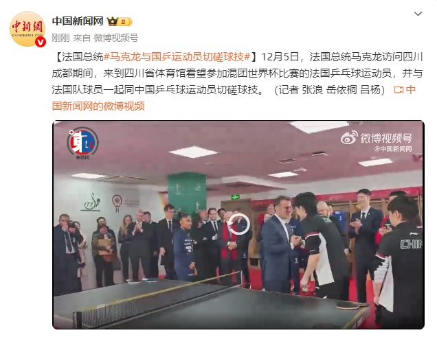 另据四川观察报道,马克龙还与中国乒协主席王励勤、中方运动员王楚钦、王曼昱、孙颖莎和林诗栋等进行互动。