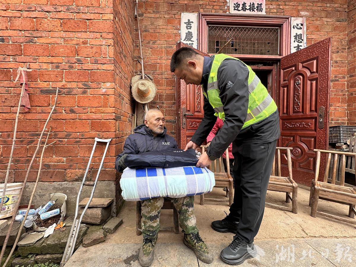“老哥,天冷了,这是省里给您发的棉大衣,快试试合不合身!”上午11时许,咸宁市应急管理局工作人员走进一间用砖瓦搭建的简朴农舍,拆开包装,将一件印有“YJJZ”(应急救灾)字样的深蓝色新棉大衣,披在82岁的李经友身上。