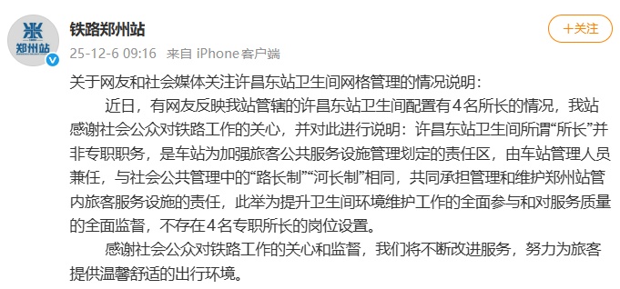 近日,有网友反映我站管辖的许昌东站卫生间配置有4名所长的情况,我站感谢社会公众对铁路工作的关心,并对此进行说明:许昌东站卫生间所谓“所长”并非专职职务,是车站为加强旅客公共服务设施管理划定的责任区,由车站管理人员兼任,与社会公共管理中的“路长制”“河长制”相同,共同承担管理和维护郑州站管内旅客服务设施的责任,此举为提升卫生间环境维护工作的全面参与和对服务质量的全面监督,不存在4名专职所长的岗位设置。