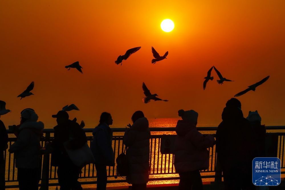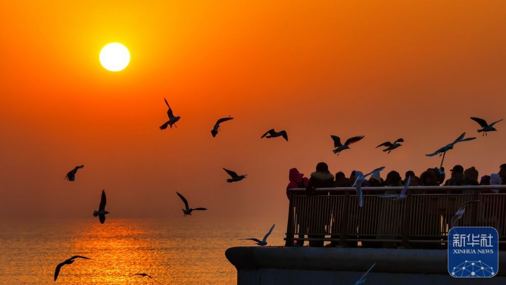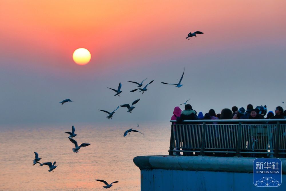 ↑ 12月6日,游人在天津市滨海新区东疆亲海公园观赏海鸥和日出。